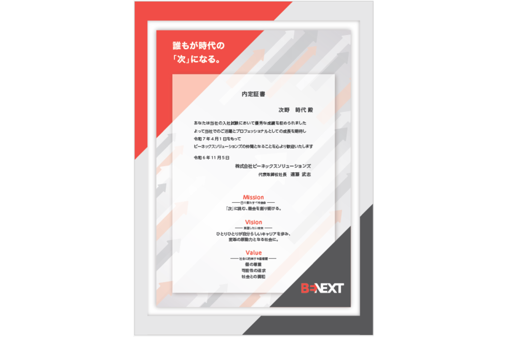 今年初の試みとして作成したオリジナルデザインの内定証書を
