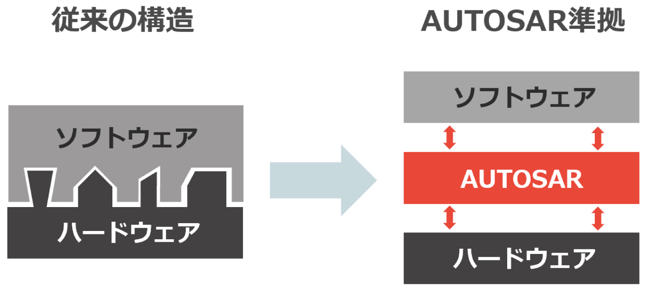 「AUTomotive Open System Architecture(オートモーティブ・オープン・システム・アーキテクチャ)」の略称で、欧州自動車メーカーを中心に『車載ソフトウェアの標準化』を目指して2003年に設立された団体または規格のことです。従来の開発では、ハードウェアの仕様に依存したソフトウェアの作成が必要で、言い換えれば、仕様の異なるハードウェアには使う事ができませんでした。そこで、あらゆるハードウェア間でも共通のソフトウェアを使えるように、ソフトウェアの規格を標準化させる(揃える)事を目的にAUTOSARが誕生しました。AUTOSAR が普及すれば、ハードウェアに合わせた独自のソフト開発を行う手間が無くなるので、開発コストの低減が期待できます。